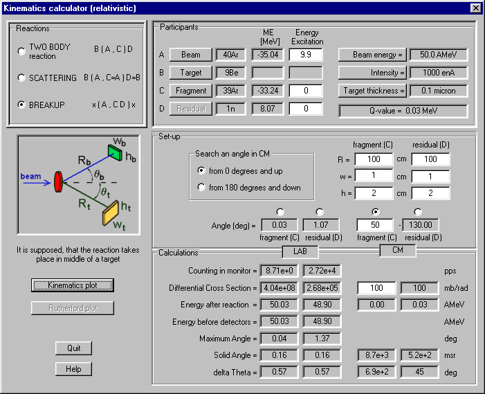 in the toolbar. The "Kinematics Dialog" is shown in Fig.1. In this dialog the user can choose one from three types of reactions. For convenience all participants of the reaction are designated by letters and the possible types of reactions are shown.