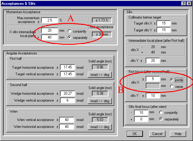 In previous versions it was assumed, that the slits in dispersive and first focal planes were symmetric, whereas the slits after the velocity filter could establish could be moved independently. In the new version the user can get all horizontal slits independently (see Fig.3). To use this feature the user has to choose the mode "Separately" (compare "A" and "B" in Fig.3).