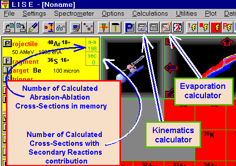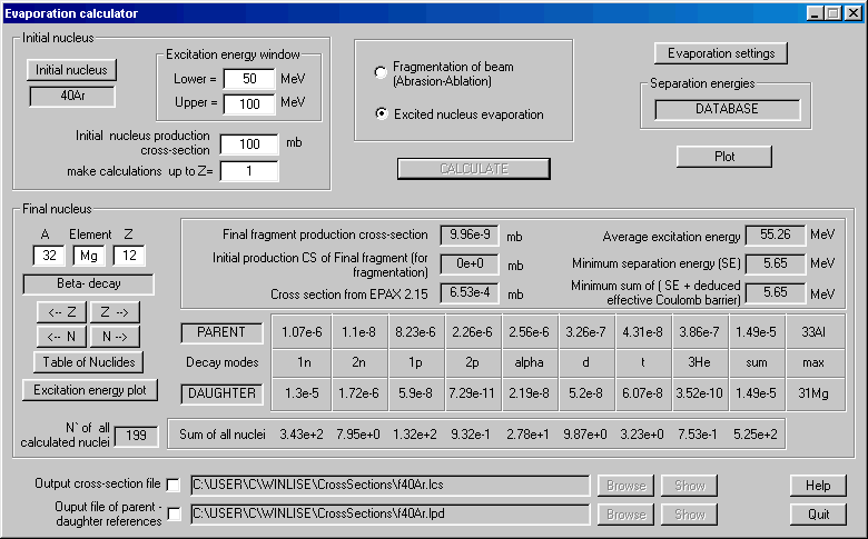 in the toolbar (see Fig.1). The "Evaporation Calculator" dialog is shown in Fig.2. The production of 32Mg nucleus from deexcitation of 40Ar is presented in this figure as an example. The excitation energy