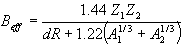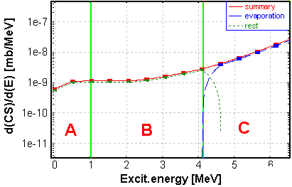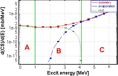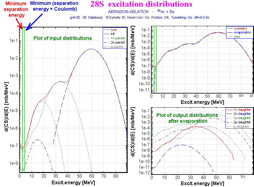 In Fig.3 and Fig.8 plots are shown with two green vertical lines corresponding to the minimum separation energy (left line) and the minimum sum of the separation energy and the effective Coulomb barrier (right line). The part of the distribution (A) located to the left of a line does not undergo evaporation (see Fig.8). The deexcitation proceeds by emission of g -rays. It is also assumed, that the part of the distribution between these two lines (B) does not undergo the further evaporation (see Fig.8, left plot). The effective barrier assumes a shift of the right line to the left, assuming a tunneling effect. The default value dR = 6 fm is taken from work [Ben98]. The effective Coulomb barrier is written as: