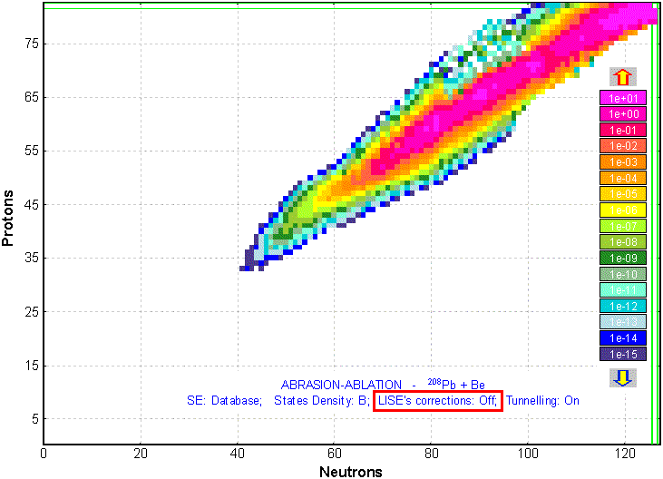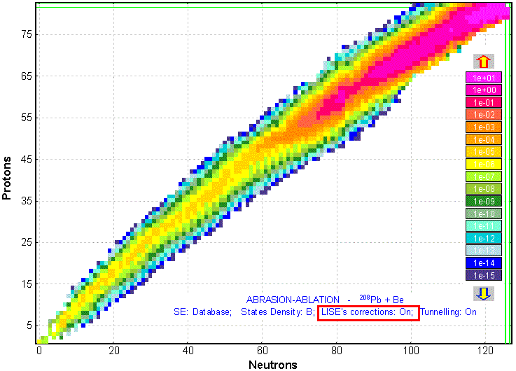 Fig.9. Cross-sections plot for the 208Pb + Be reaction. LISE corrections for Geometrical Abrasion-Ablation model are switched OFF.
