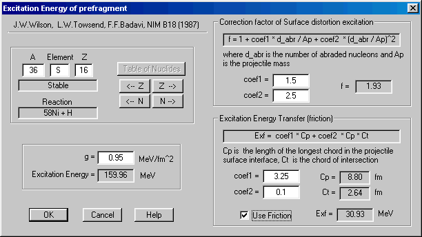 The user can change coefficients of correction factors in this dialog. Original coefficients in the work [Wil87] for correction factor expression (17) are 15 and 25. We assume, that these coefficients are erroneous. Real values should be in the range 1.5 and 2.5 correspondingly. For example, if to suggest a projectile half-part abrasion the correction factor will be equal to 14.75! Comparing excitation energy with the work [Gai91], more real vale of the correction factor should be about 2.