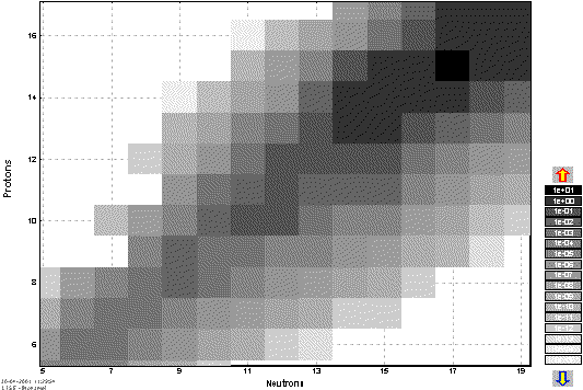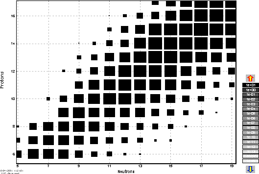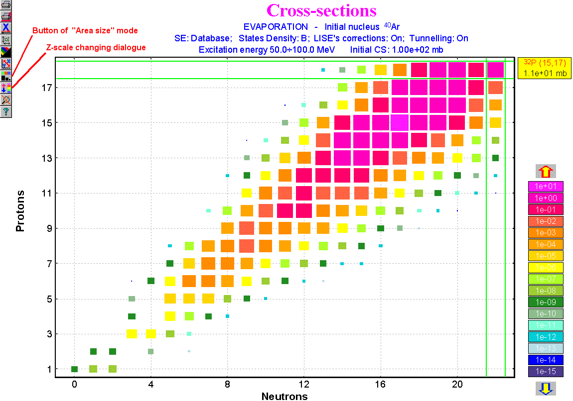 The user can observe results of the evaporation calculator using plots of input and output energy distributions for a given nucleus (see Fig.3) and a two-dimensional plot of cross-sections (see Fig.4). The 2D-dimensional plot is a new feature in the program. The data is represented by rectangles centered at N (neutrons) and Z (protons), where the cross-section value depends on color and size of the rectangle. The user can change the display modes of rectangles (see Fig.5), and also change the scale (see Fig.6).