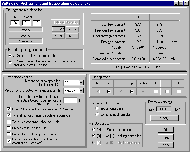 | The "Evaporation settings" dialog (see Fig.7) can be accessed from the "Evaporation calculator" dialog or from the "Options" menu. Eight decay modes are available in the code. The user can not