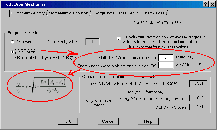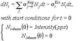 In the new version of the program the contribution of secondary reactions is not taken into account in calculations of transmission and outputs of fragments (due to durable calculations), but the User only can make a rating using the menu "Utilities" -> "Output of products from a target with the contribution of secondary reactions". Calculations are carried out step by step on the basis of system from j differential equations with given below start conditions: