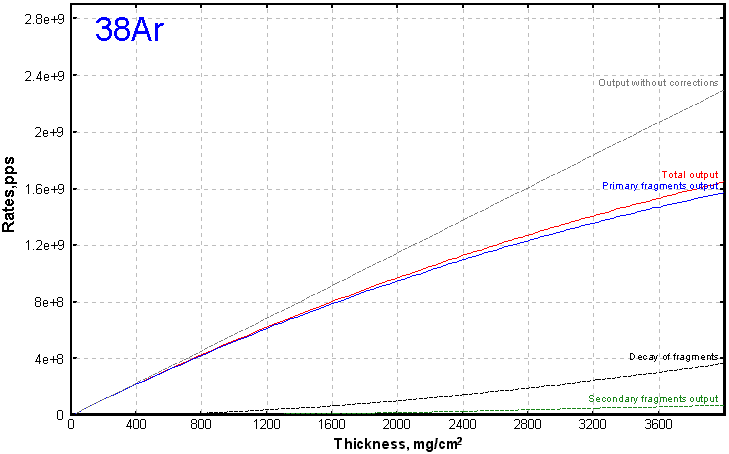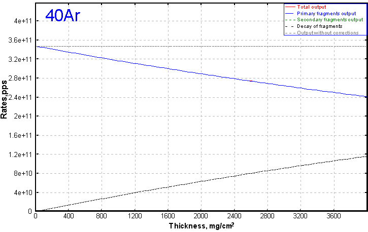 As an example we shall take recent work on studying cross-sections of neutron-rich nuclei from 40Ar fragmentation at about 1 AGeV (A.Ozava et al, Nucl.Phys A673 (2000) 411). For super neutron-rich isotopes was used in this experiment the Be-target by thickness 4007 mg/cm2 (21.7 mm). On figures 1-4 calculations of outputs are presented depending on thickness of a target for this experiment. The first figure shows reduction of intensity of an initial beam. From three following strong influence of secondary reactions for unstable super neutron-rich nucleus 28O where their contribution exceeds on the order the contribution from initial reactions is visible.
