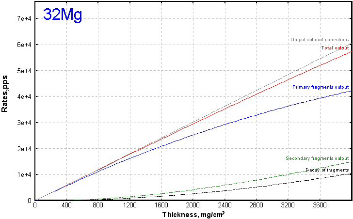 Fig.3. 32Mg outputs in the reaction 40Ar(1AGeV)+Be(4007 mg/cm2)