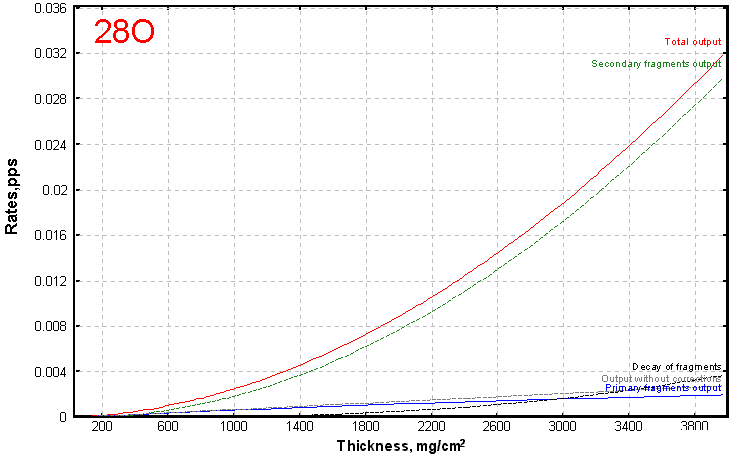 Fig.4. 28O outputs in the reaction 40Ar(1AGeV)+Be(4007 mg/cm2)