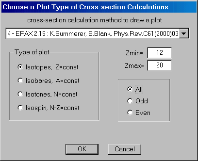 | On a wish of users in the program was new opportunities for visualization of distributions of cross sections and others are entered: the user can look simultaneously some distributions (for different Z depending on mass and so on). It is possible to make selection of distributions: even Z, odd Z, and all distributions. In a figure on the right it is presented menus of a choice of distributions for the plot. |