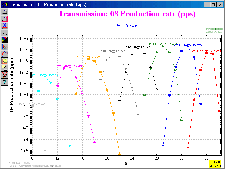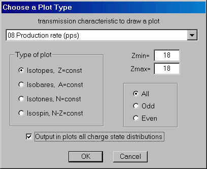 | The opportunity to observe distribution of characteristics of transmissions of fragments to plots has appeared ("Plots"-> "Transmission characteristics") in the new version at users. In other words it is possible to look outputs of fragments, outputs of charging states and to compare angular or spatial transmission of fragments and so on. (look a picture on the right). The example of this new type of the plots, representing an output of fragments with even Z and with a charge state condition equal Qt=Z is below submitted. |
